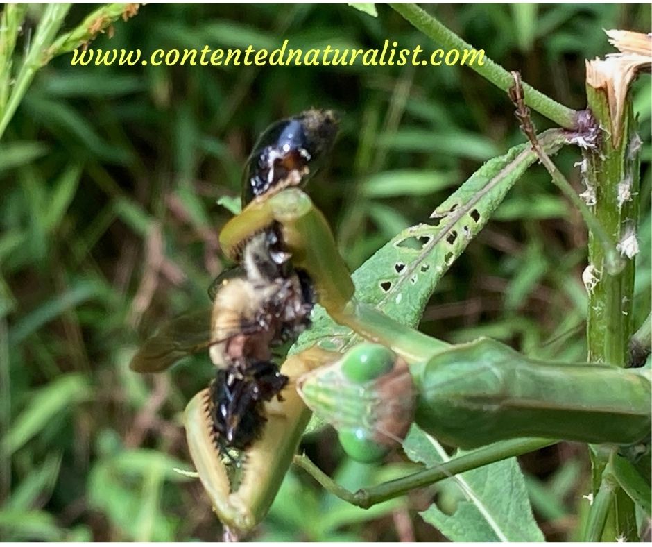 I can also turn the conversation to broader themes if a group sticks around, such as how climate change might mismatch the timing of goldenrod blooms and monarch migration. Other times we might find yet another interesting animal that shifts our focus. I once had started my lurk near several large praying mantises, one of whom had already caught a bumblebee and was devouring it. Not long after pointing them out, however, a passing dog walker suddenly yelped and stumbled, trying to avoid something underfoot. When he regained his footing, he exclaimed, “A snake! A green snake!” A small green snake had crossed the path and disappeared into the tall grass. We all watched as the snake’s path was betrayed by the moving grasses. Soon it emerged at the base of a tree, and slowly wove its way around the trunk. It paused from time to time, exploring some dead vines, before eventually disappearing back into the grass.