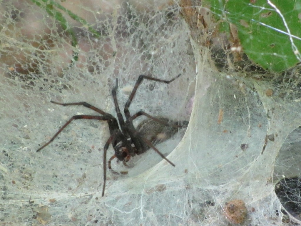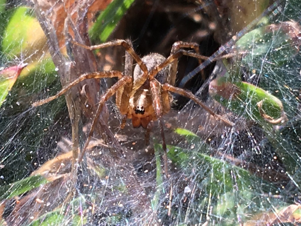 There are so many different types of web spiders in my area. Some are orb web spinners, who make the familiar eight-spoked roundish webs. There are grass spiders which spin flat sheets of webbing, and funnel spiders that spin funnels of webbing in which they hide, waiting to jump out at prey that blunders into their web. I even saw one orb web spider that apparently took a lesson from the funnel spiders– it had glued together the top edges of a leaf beside its web, creating a safe retreat when a big predator (me) came poking a camera near the web!