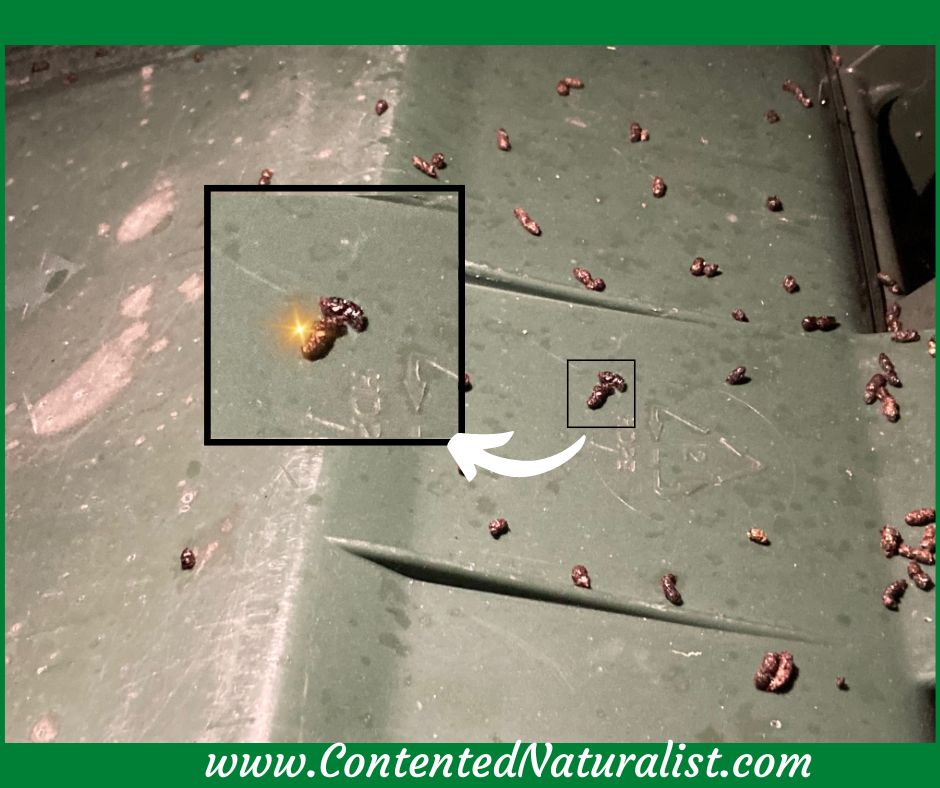 As a naturalist, I spend a lot more time poking around in other creatures’ excrement (also known as scat) than most people. I love finding clues to the animal’s identity and diet, like the fish scales and bones in an otter’s scat, or how when the pawpaws are ripe, suddenly every pile of fox poop and racoon poop is chock-full of the large seeds. But every now and then I discover something extra cool. This fall, I found out that at least in my area, bat scat sparkles!