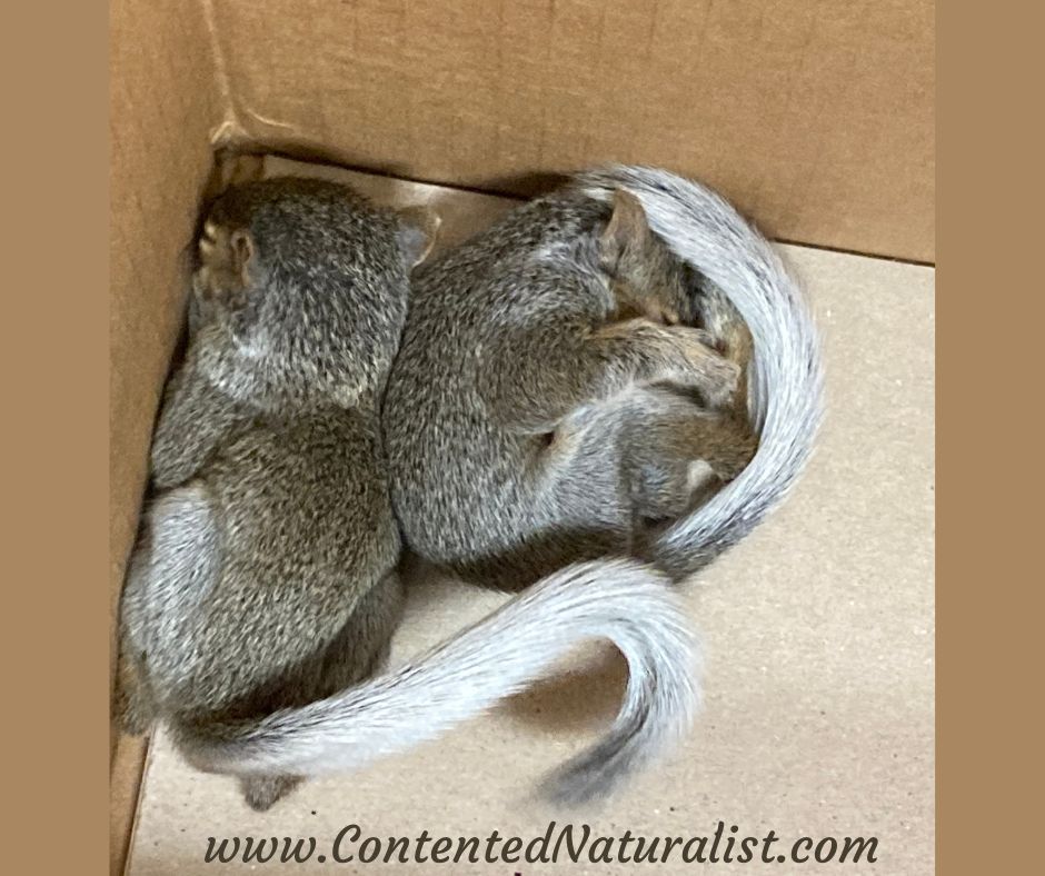 The next day when I came in, my coworker explained she brought them to her friend the rehabber on her way home. Apparently the babies looked ok, and perhaps their mother had been killed somewhere recently so she couldn’t return. We figured road kill or else falling prey to a red-tailed hawk. After a couple weeks of care with the rest of the orphaned squirrels the rehabber already had in care, they planned to release them. Our pups wouldn’t be coming back to the park, though. Since they were integrating with a large group, there was no practical way to keep them separate. This rehabber had an arrangement with a nearby park of some kind to release squirrels there, so that’s where they would go.